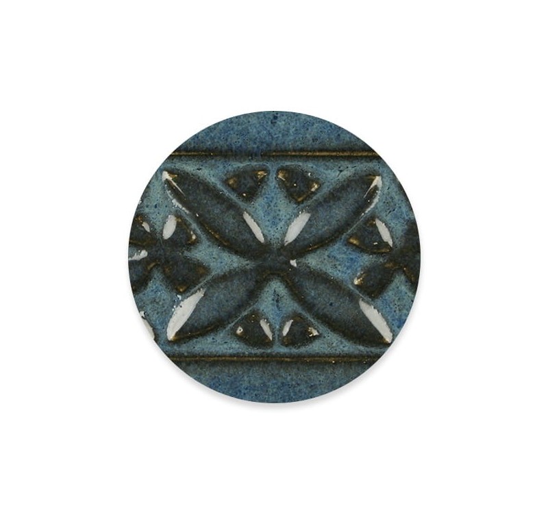 Amaco PC- Blue Midnight is a glossy, almost black glaze that breaks into blue tones where applied thickly. The blue highlights are particularly emphasized in texture, giving a vibrant and deep expression. The glaze is well-suited for textured work and can also be used in combination with other glazes for varied surface effects. Best results are achieved with generous application.