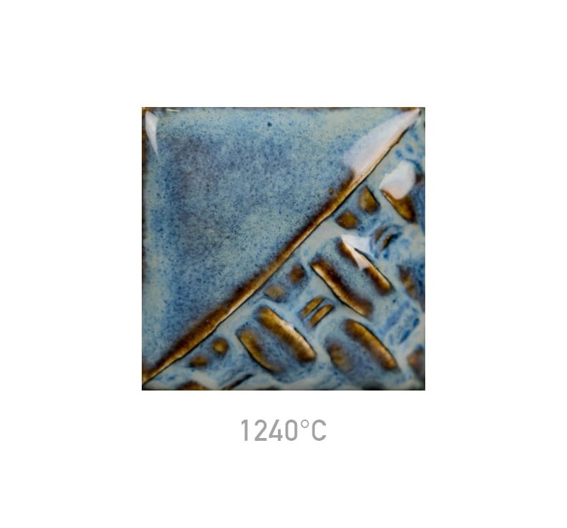 Provplattorna som visas är brända platta på vit lera, med olika bränningsmetoder och temperaturer. Som alltid kan slutresultatet variera, och det rekommenderas att testa glasyren på provbitar innan användning på färdiga arbeten. Följ tillverkarens anvisningar och använd vanliga försiktighetsåtgärder vid hantering av glasyrer.
